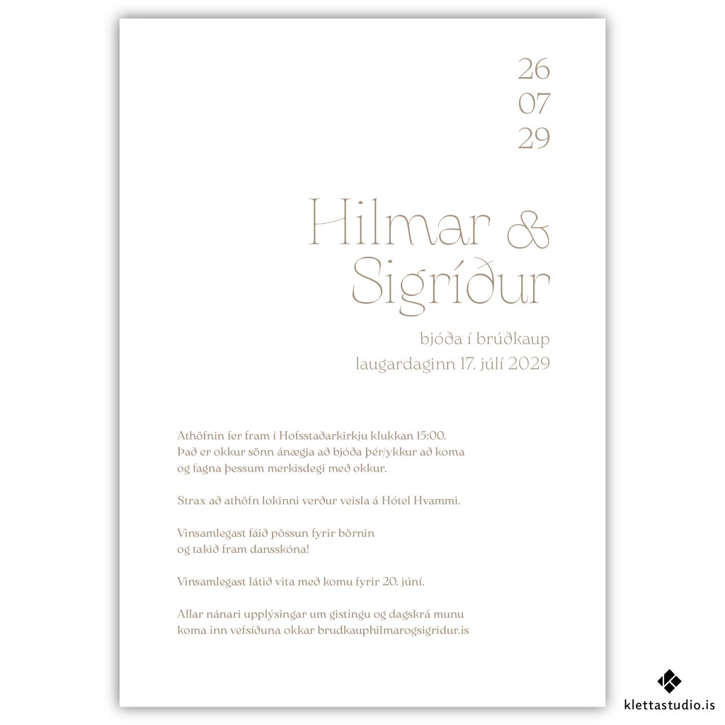 Stílhreint brúðkaupsboðskort með hvítum grunni og brúnu letri  (hægt er að breyta um lit í letri).