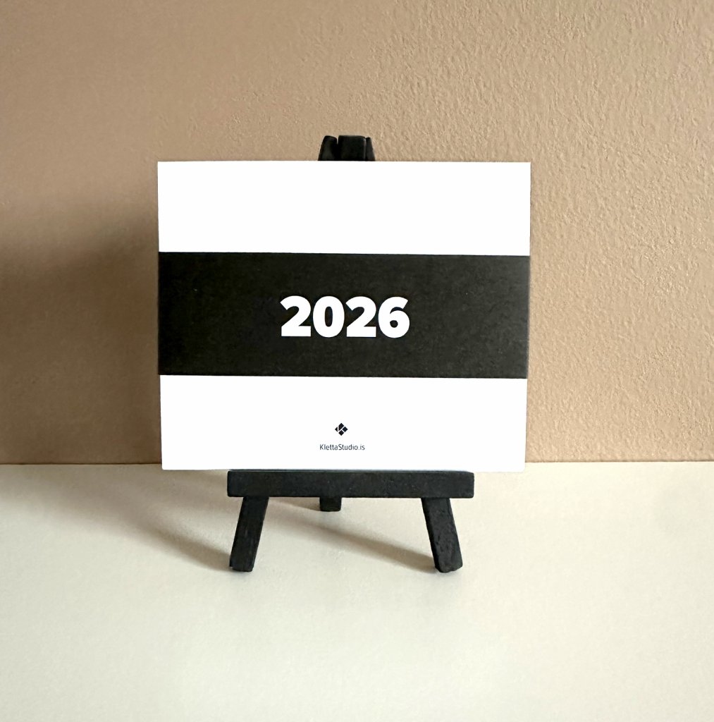 Dagatal 2026 á litlum svörtum trönum. Stærð 12x10 cm.
