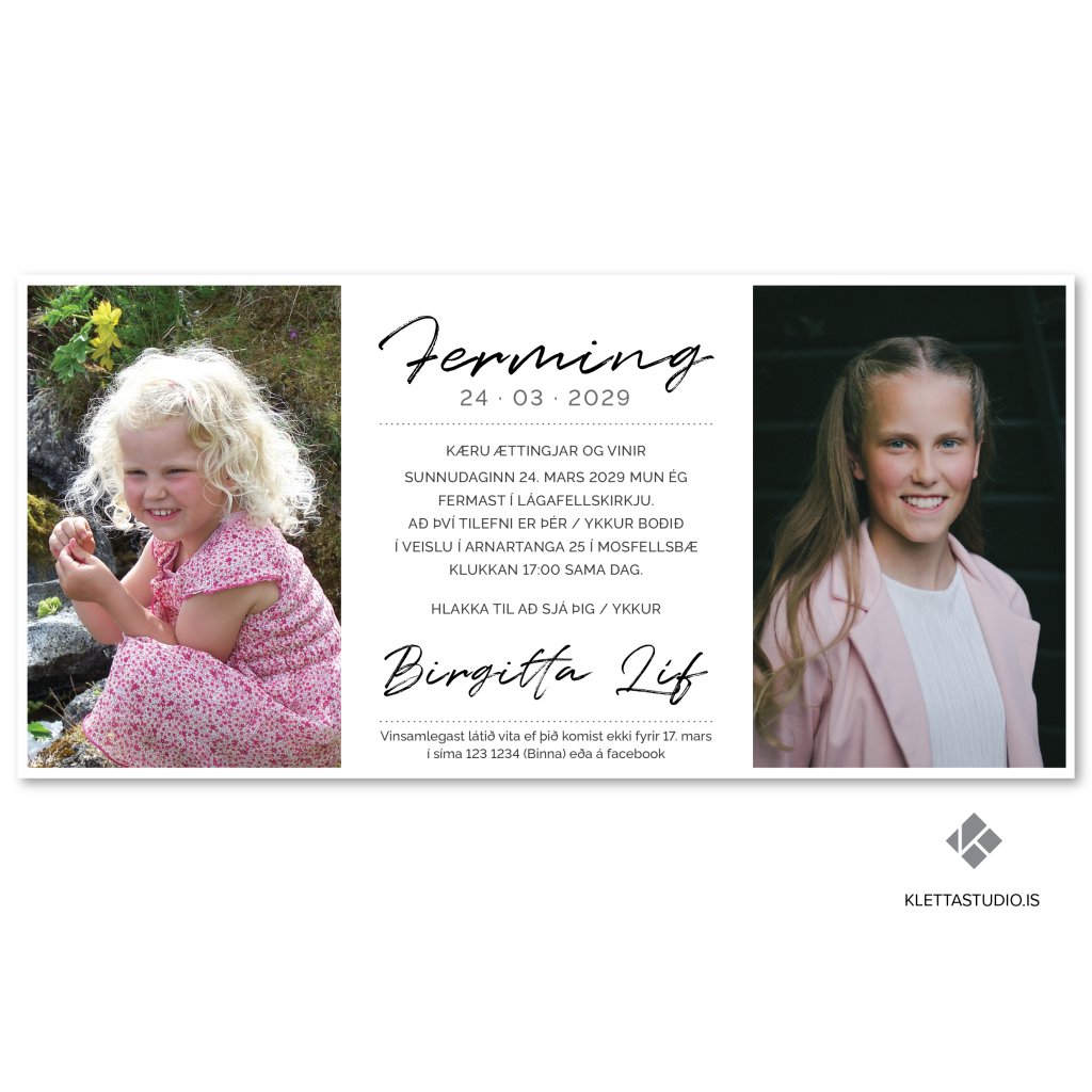 Látlaust en fallegt fermingarboðskort með tveimur myndum. Tilvalið að nota eina gamla og eina nýja mynd af fermingarbarninu.