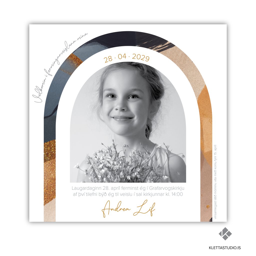 Stílhreint og fallegt fermingarboðskort með einni mynd. Liturinn í boganum er í jarðlitum, gylltum og bláum tónum.
