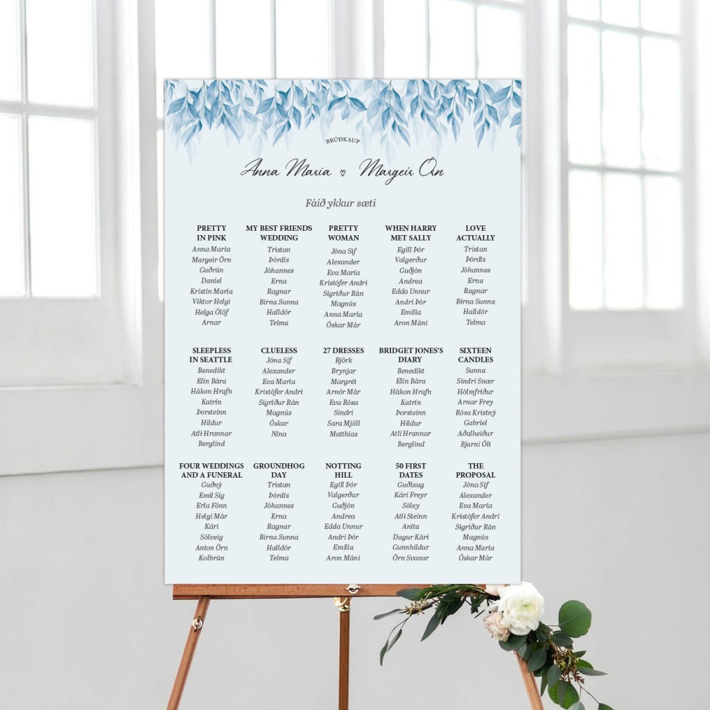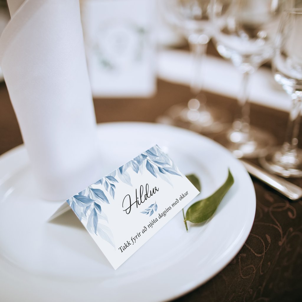 Brúðkaupsboðskort með bláum tónum bæði í bakgrunn og í laufunum.