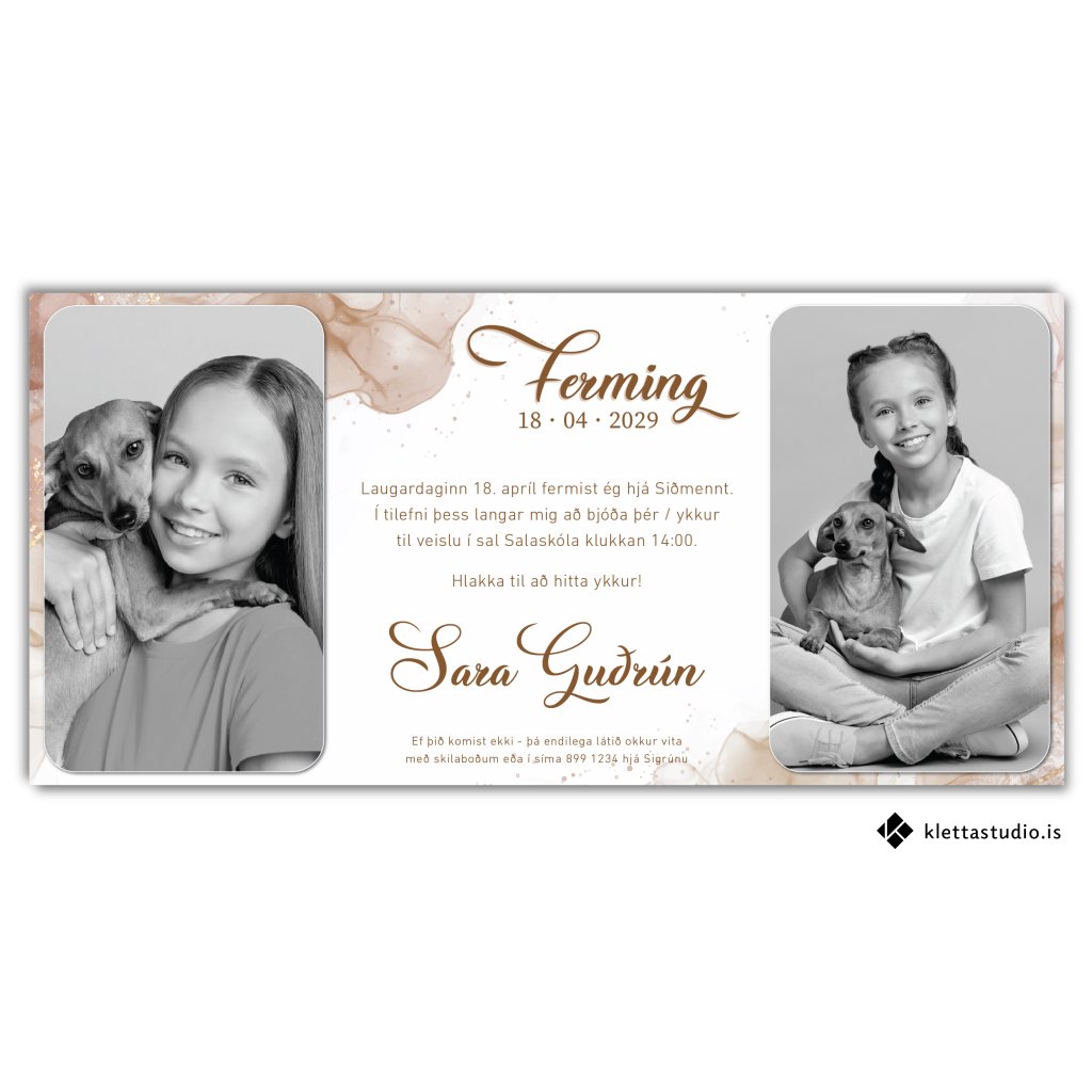 Fermingarboðskort með tveimur myndum.